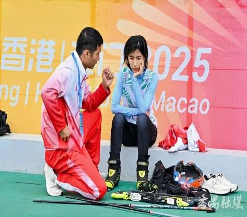 湖北队教练黄选祥望着自己的队员朱钰鑫,并对记者说:“她才12岁,是未来可期的运动员。”据了解,小将朱钰鑫虽然是团队中年龄最小的队员,但是在本次比赛中成绩突出,在智力残疾组女子个人传统技术800米比赛中获得金牌。领队熊昕子表示,这些孩子是湖北在越野滑轮项目中“第一批吃螃蟹”的人,她希望这些孩子带着使命感与责任感站上更高的领奖台。