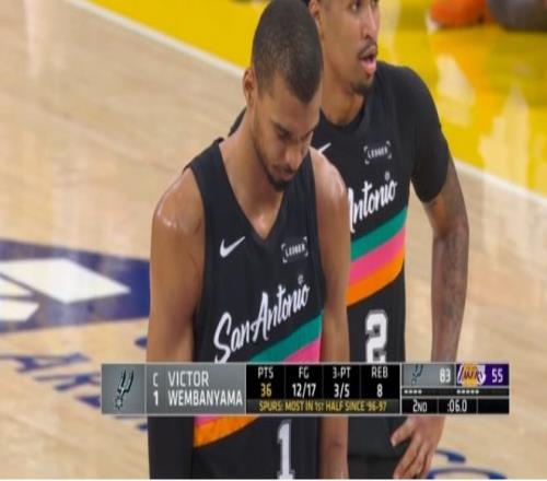 六,文班亚马上半场得到37分,创造马刺Play-by-play时代上半场最高分纪录。