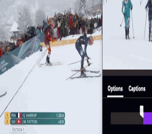 选手穿着贴皮雪板进行高强度推进。贴皮依靠纤维的各向异性摩擦特性实现“前滑顺畅、后滑受阻”。高水平选手的步频极为稳定,雪板抬离雪面的高度被控制在最低限度,以减少能量浪费,所以这个阶段运动员看起来像是在跑步或者竞走。