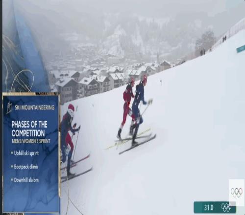 奥运会的滑雪登山短距离比赛赛道被压缩在观众可以完整观看的范围之内,赛道总长750米,爬升总计70米,赛程3分钟左右,用时最短的运动员胜出。