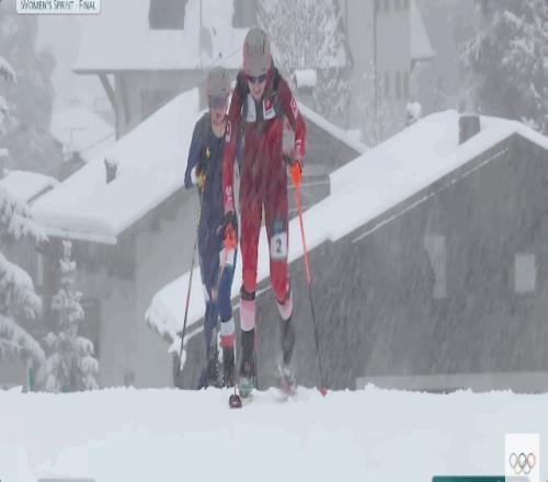 世锦赛三冠王、身穿蓝衣头戴灰粉色头盔法国名将埃米莉·哈罗普无疑是女子短距离比赛的夺冠最大热门,第一赛段和第二赛段的配速都遥遥领先,但是在转换区穿板时她出现了明显失误,被瑞士选手、世锦赛双冠王,身穿红衣脚踩黄色雪板的玛利亚内-法顿超越。