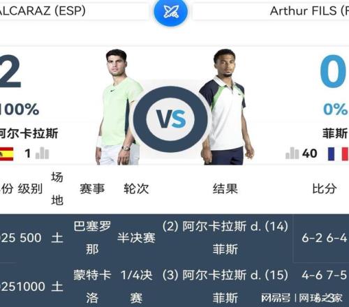 年轻的阿尔卡拉斯和菲斯,职业生涯在去年有过两场交锋。第一次发生在蒙特卡洛大师赛1/4决赛,阿尔卡拉斯以4:6的比分输掉第一盘,第二盘先后挽救了七个破发点(包括5:5之后的第11局0:40面临三个连续的破发点),才以7:5的比分艰难扳回一盘,最后的决胜盘又在1:3落后的危境下连胜五局,逆转淘汰了菲斯。第二次发生在背靠背的ATP500巴塞罗那站半决赛,阿尔卡拉斯两盘轻松过关。