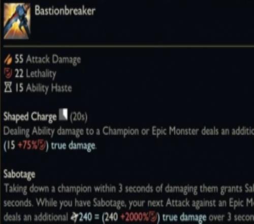S16刺客装备【破垒者】效果:参与击杀后可对野怪防御塔造成一次高额真伤 -