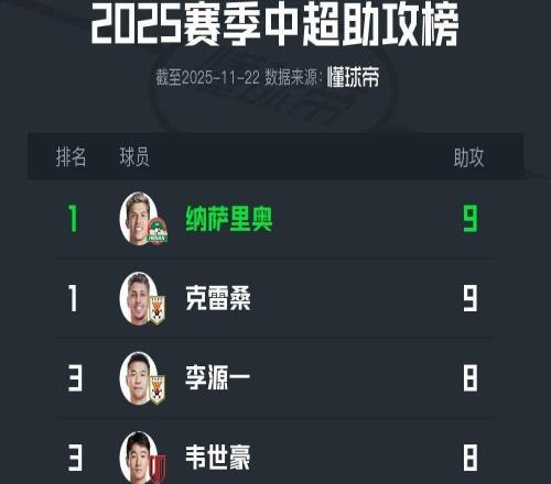 2025中超助攻榜:纳萨里奥、克雷桑9次并列第一,韦世豪8次 -